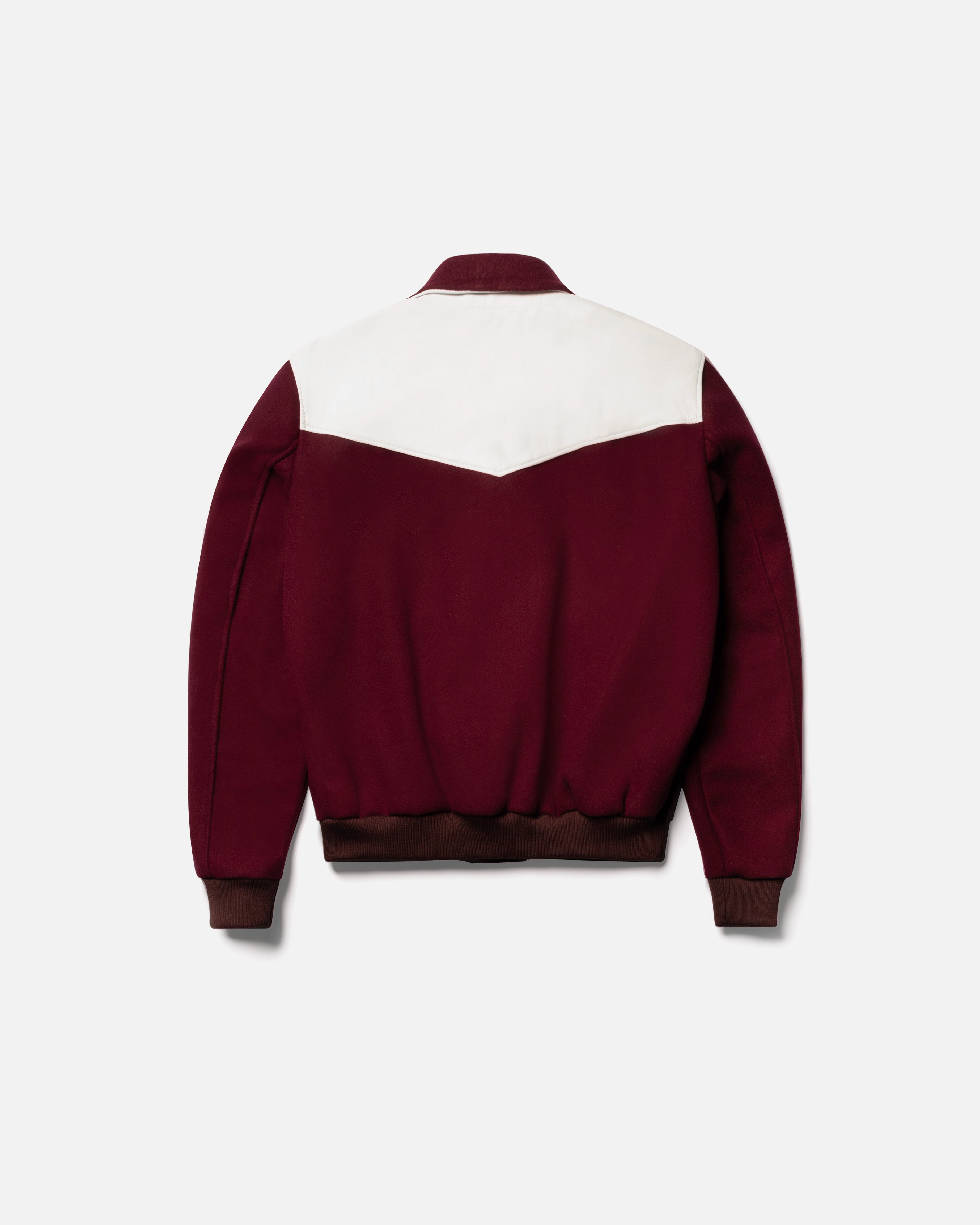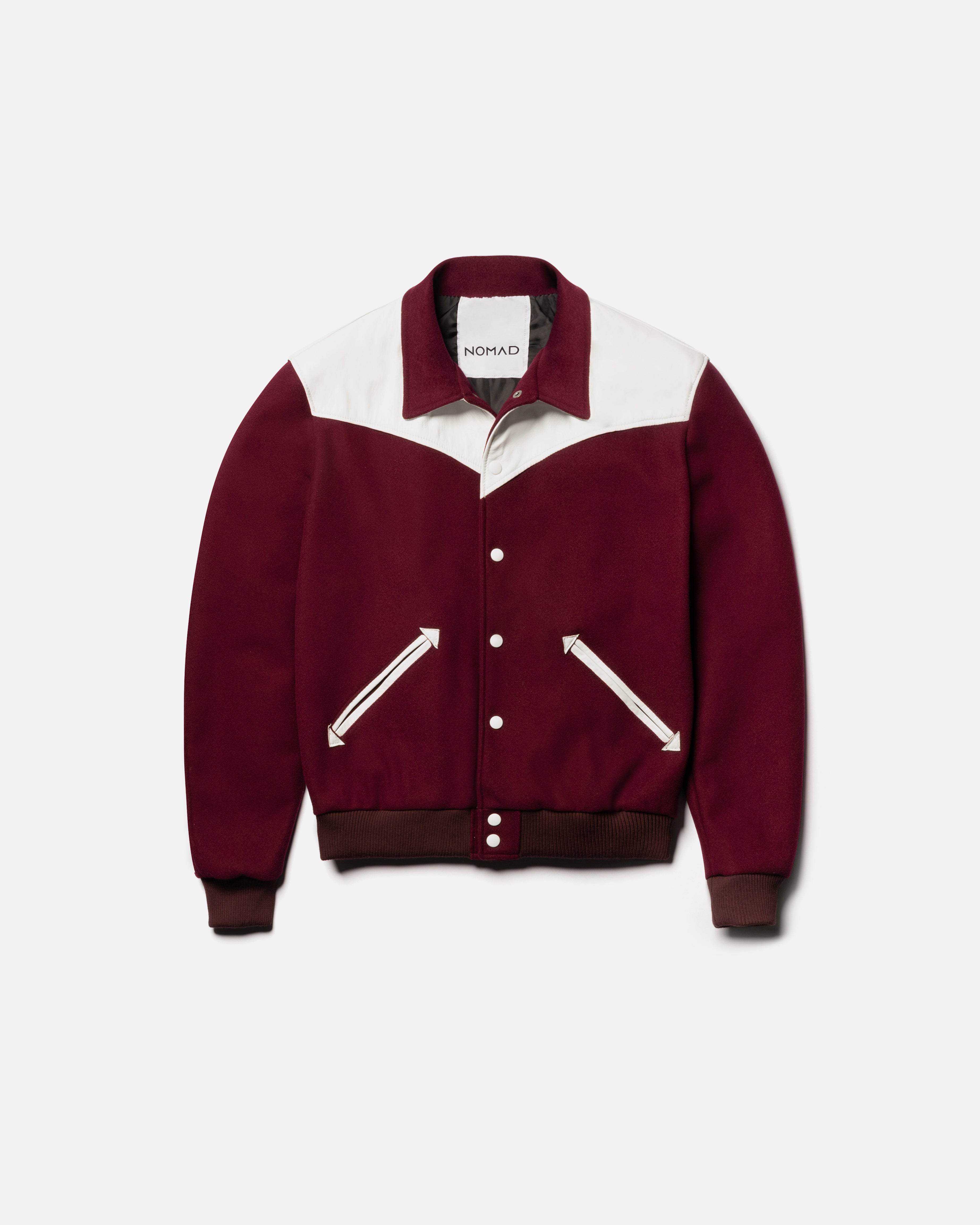 Bomber Teddy, tessuto panno colore bordeaux, inserti in pelle di vitello colore panna.