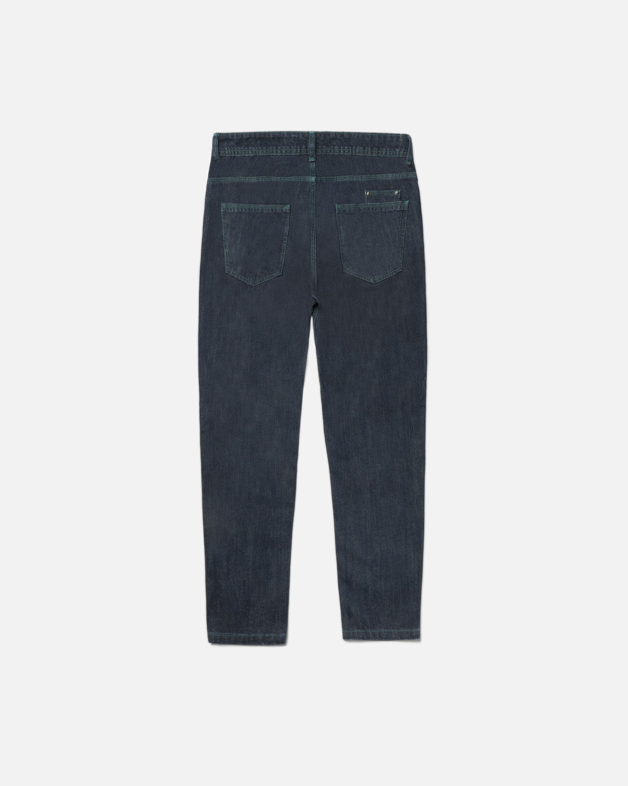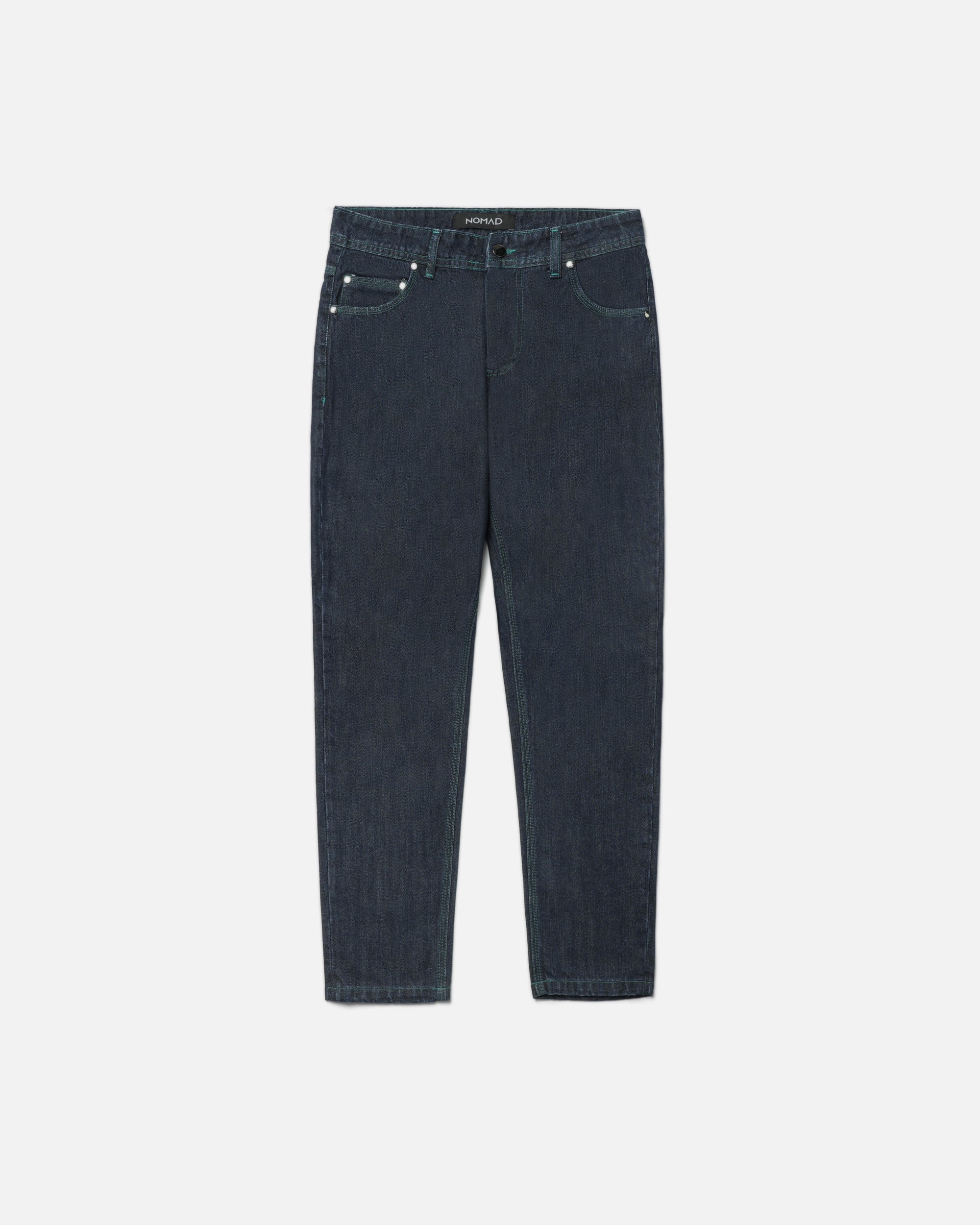 I Jeans India, dal taglio dritto con una vestibilità 5 tasche, lunghezza caviglia in Denim grezzo leggermente risciacquato, con cuciture in contrasto di colore verde, larghezza fondo 16cm