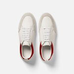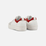 Sneakers in pelle di vitello martellata colore bianco, bordo tallone Bordeaux, altezza suola 4 cm.